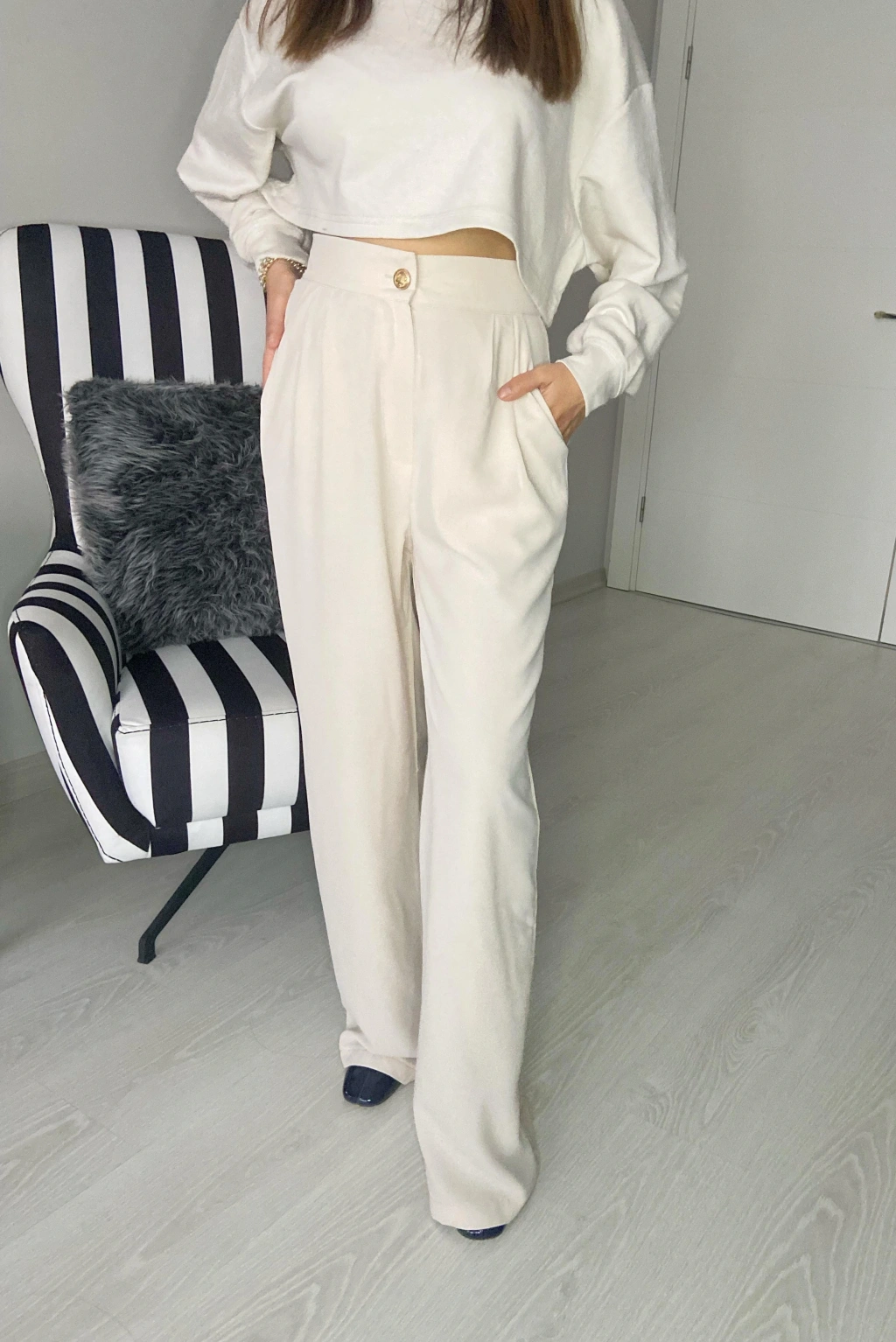 Krem Pantolon Üstü Pileli Tek Düğme